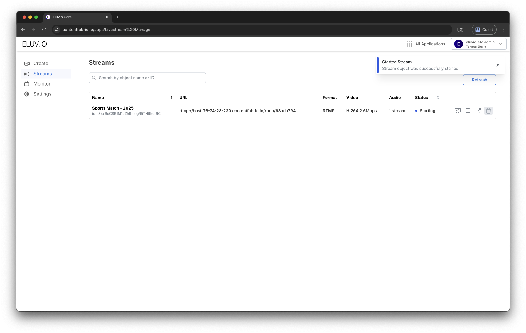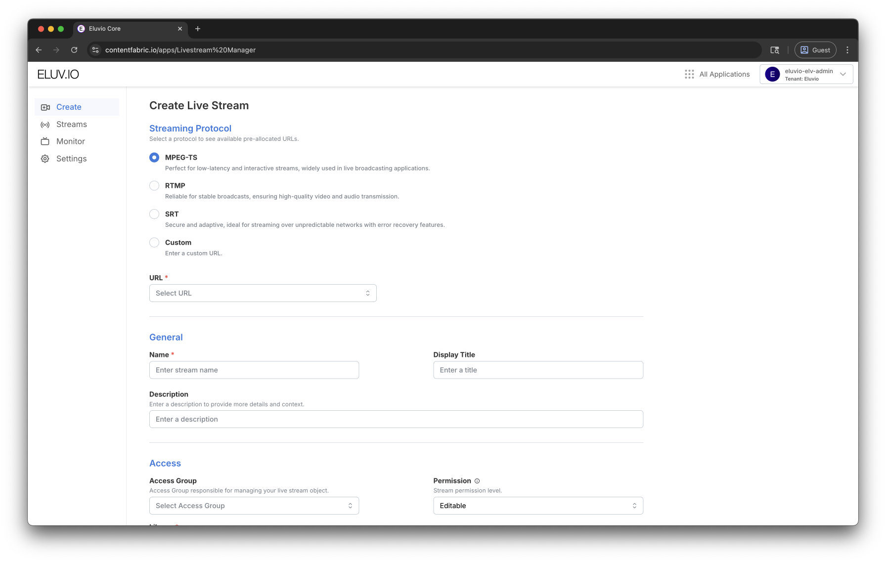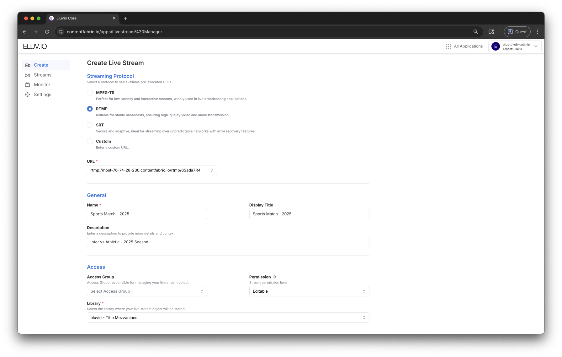 This section covers instructions on creating a live stream using the Eluvio Livestream Manager.