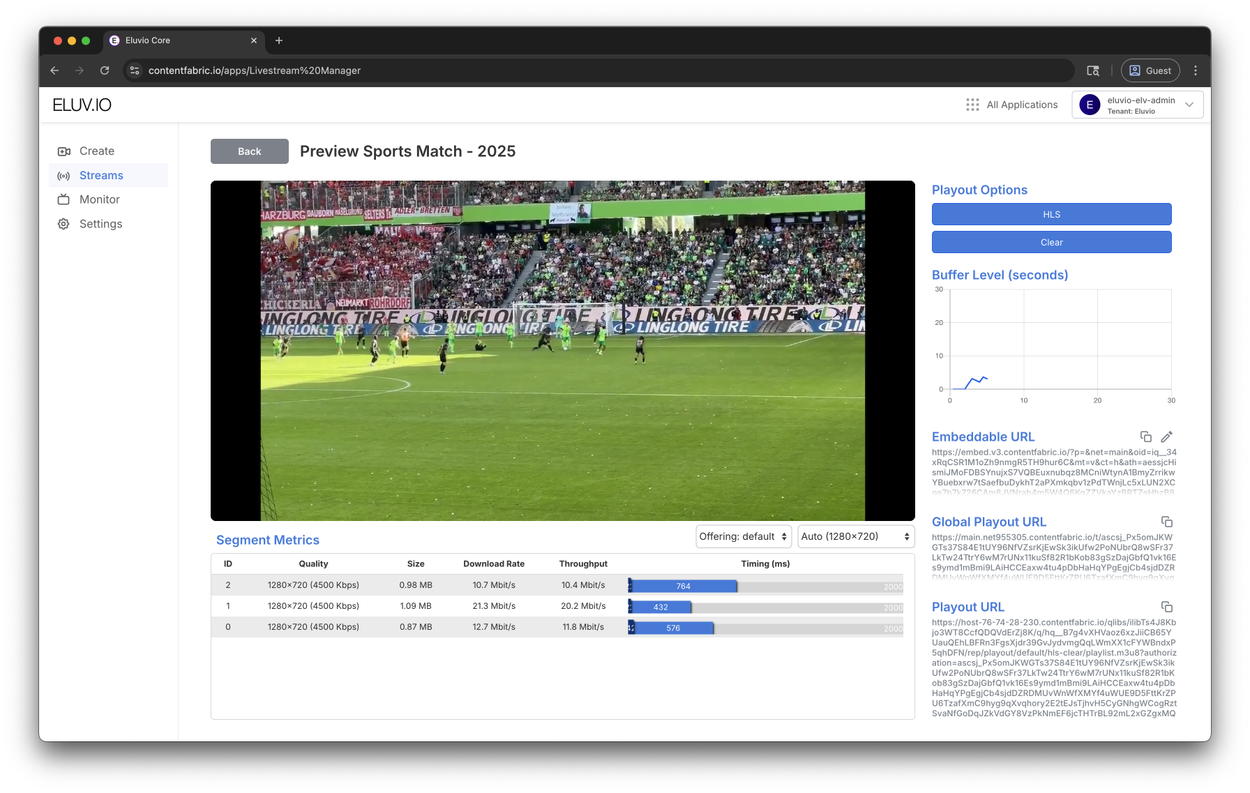 You will be taken to the stream preview with a player to view your stream. From here you can gather an embed url for sharing or direct playlist urls to plug into any player that supports HLS.