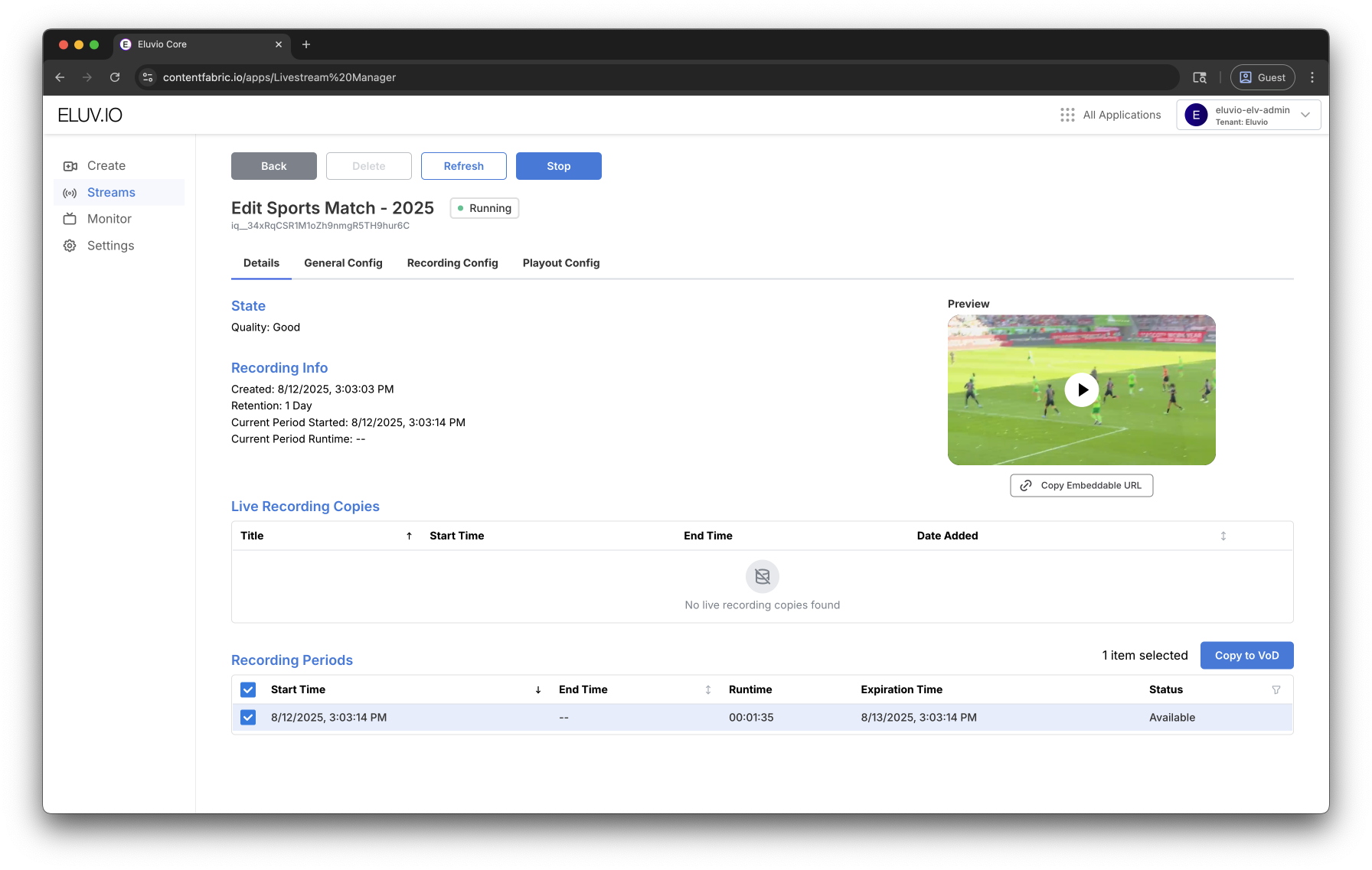 NOTE: Streams MUST be in the “running” or “stopped” state in order to run Live To VoD.