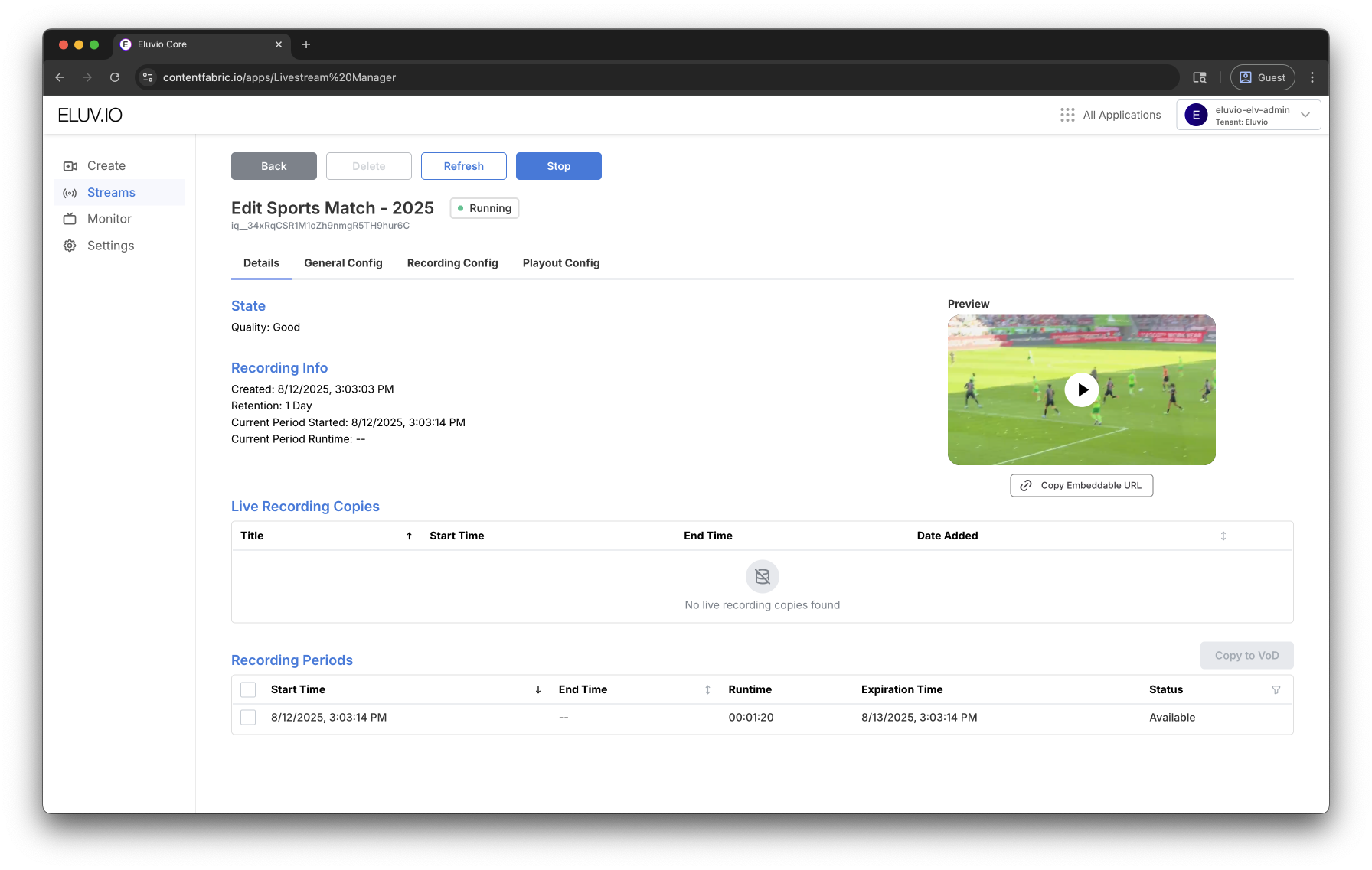 - The bottom table is the “Recording Periods”. These are the elements of a live stream which can be copied to VoD. A Recording period gets added to the table each time the stream stopped and started. These recording periods are what get copied to VoD objects. Rows that have existed longer than the stream TTL (1 week) will be marked as “Not Available” and cannot be copied to VoD. To create a VoD we will select a period with an “Available” status from the “Recording Periods” table.