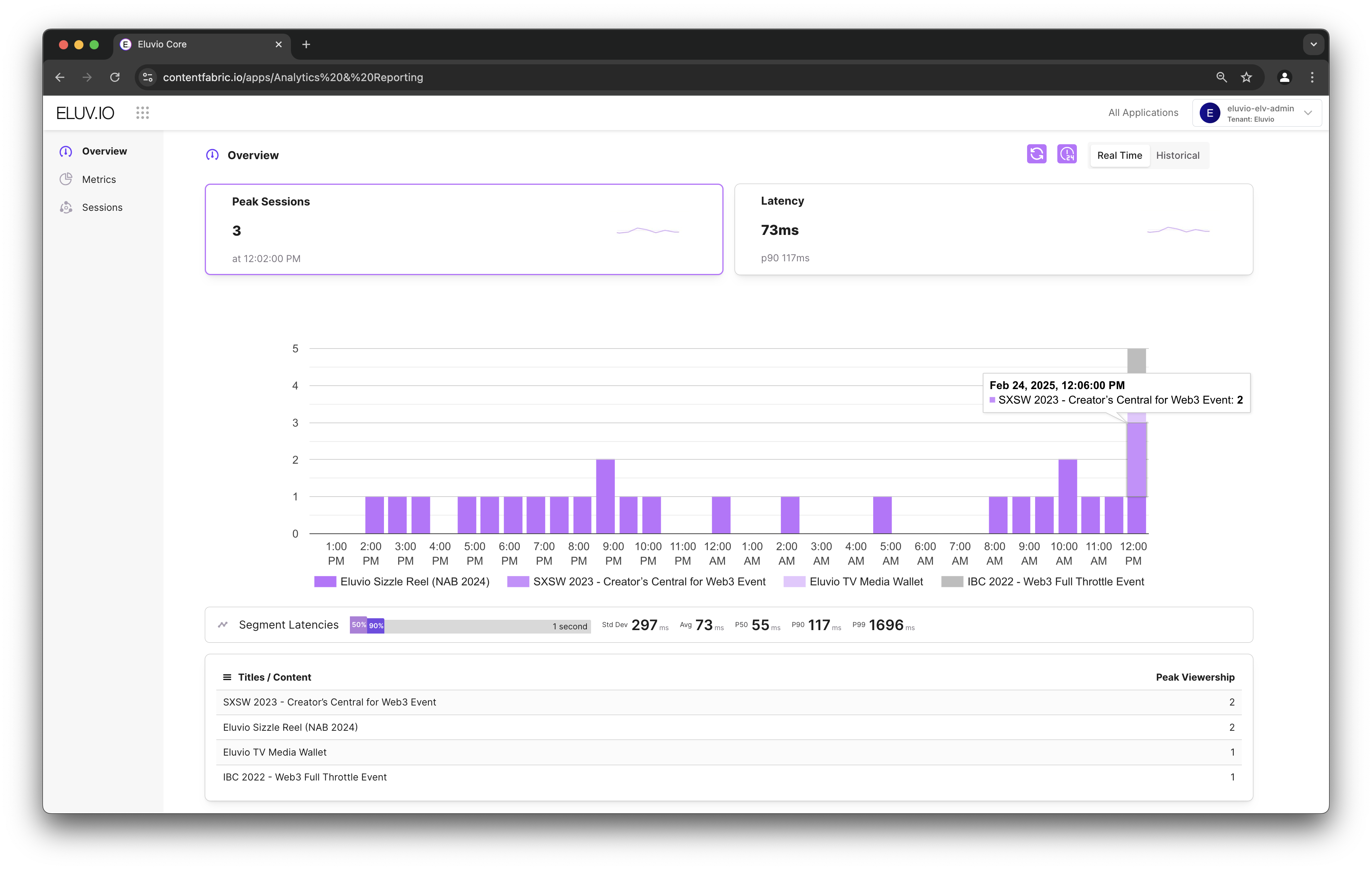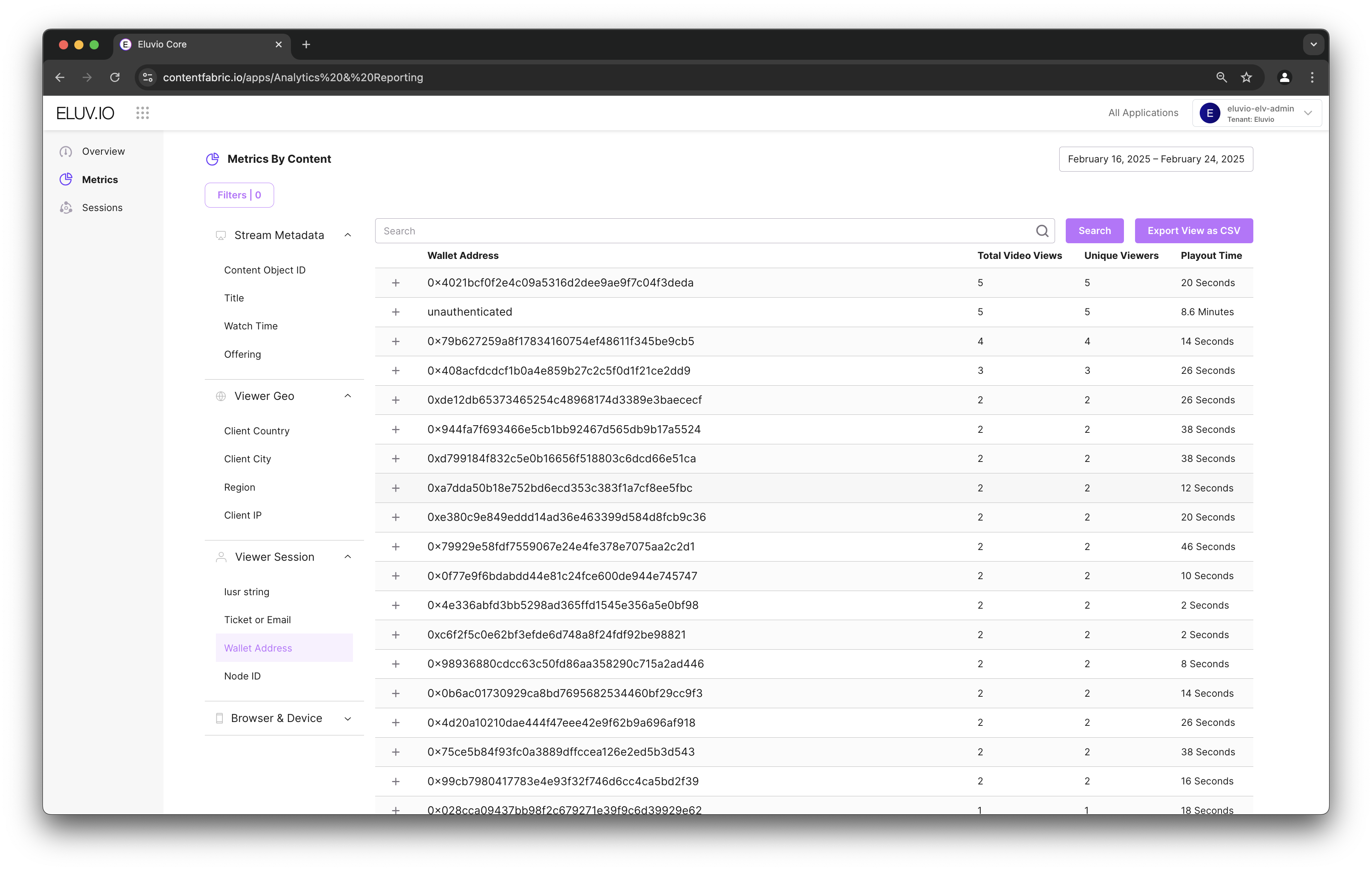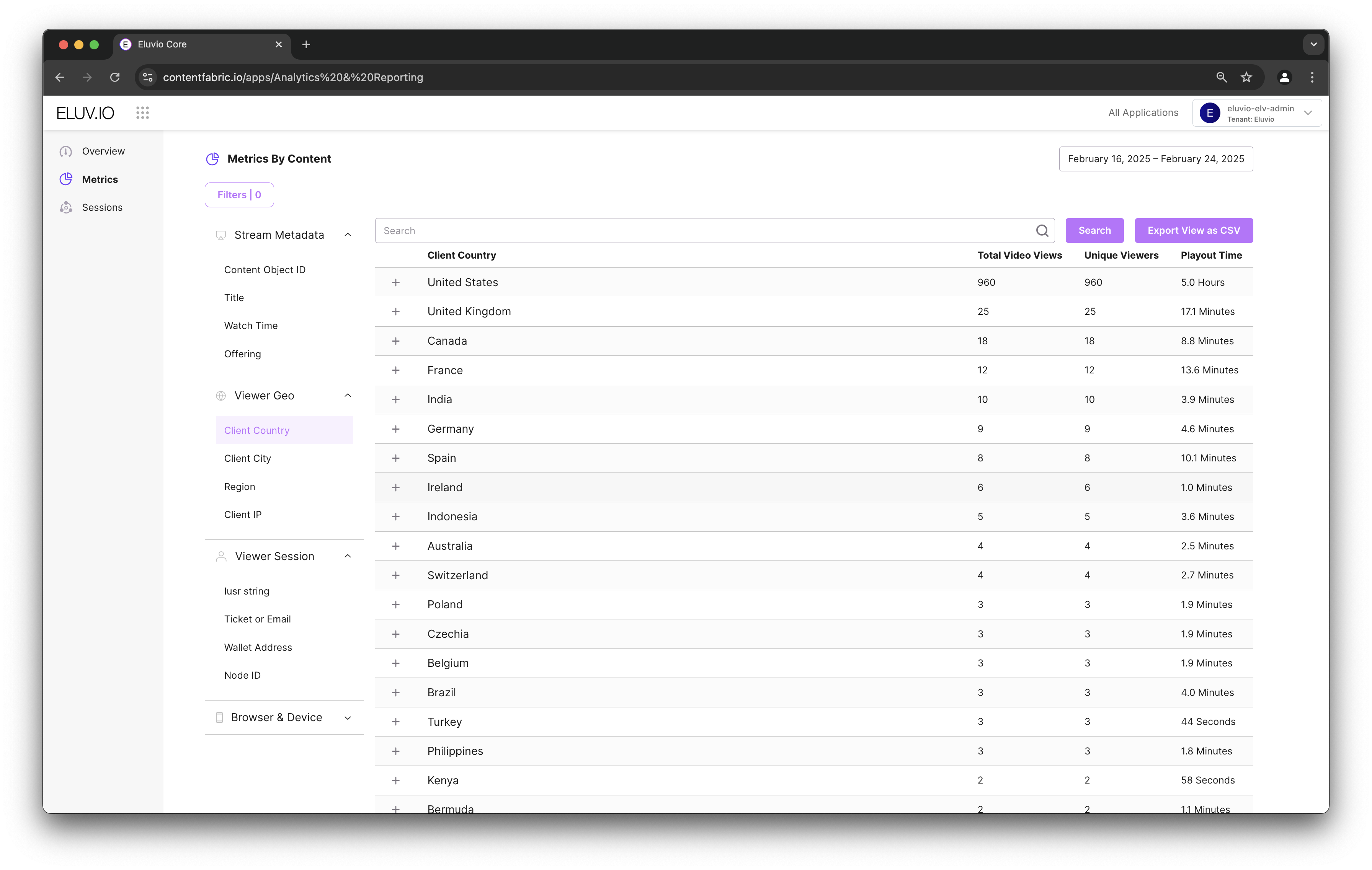 The Content Fabric collects detailed resource usage for each tenancy. This information is used to calculate utility charges and create usage reports. The new Analytics & Reporting app provides a detalied overview of every content object streamed under a specific tenancy. It displays valuable information regarding utility metrics, averge latency, total number of unique user sessions and client geolocation data on a specified period of time. Tenant Admins are able to apply multiple filters and export usage data to gain valuable insights of their streamed content.